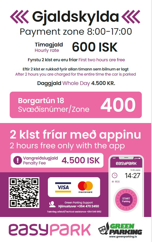 +354 470 2450 or send an e-mail: hjalp@greenparking.is.