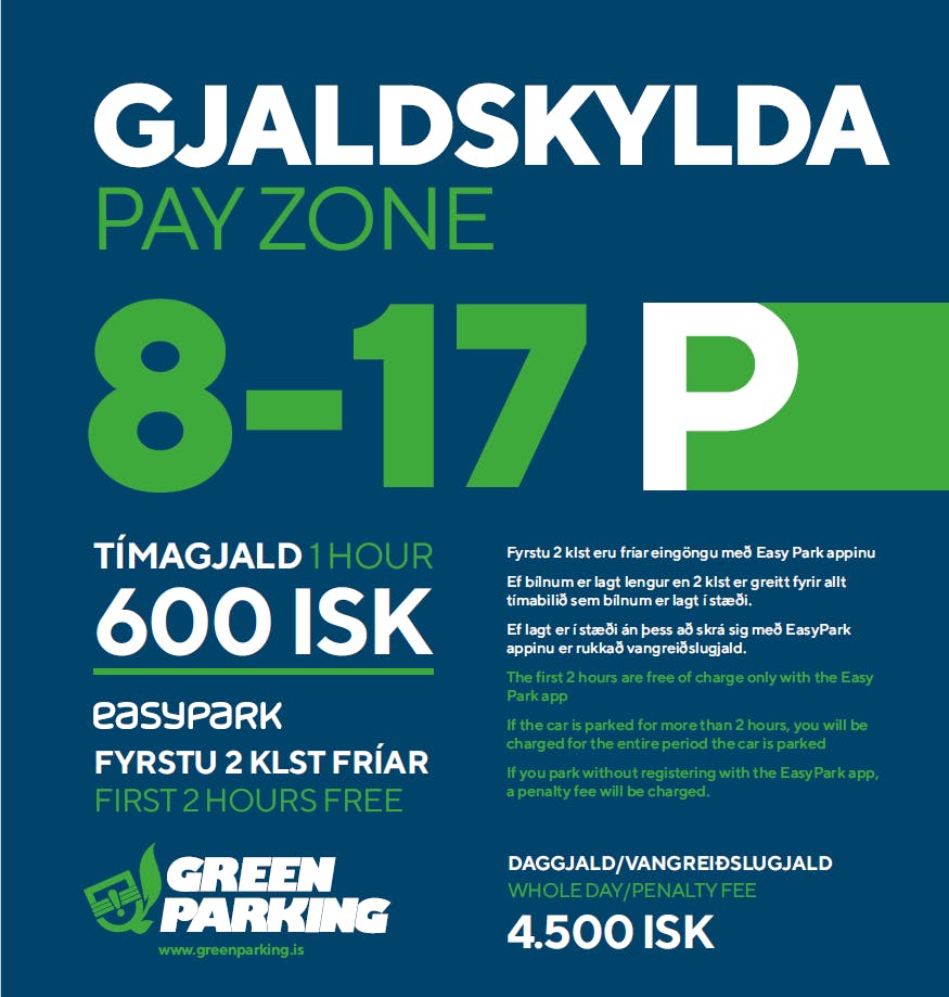 A security guard will be in the area to look after what cars have not registered their vehicle in the Easy Park app. Those who don't register the car will receive an invoice for parking as a non-payment fee: 4.500 ISK.-