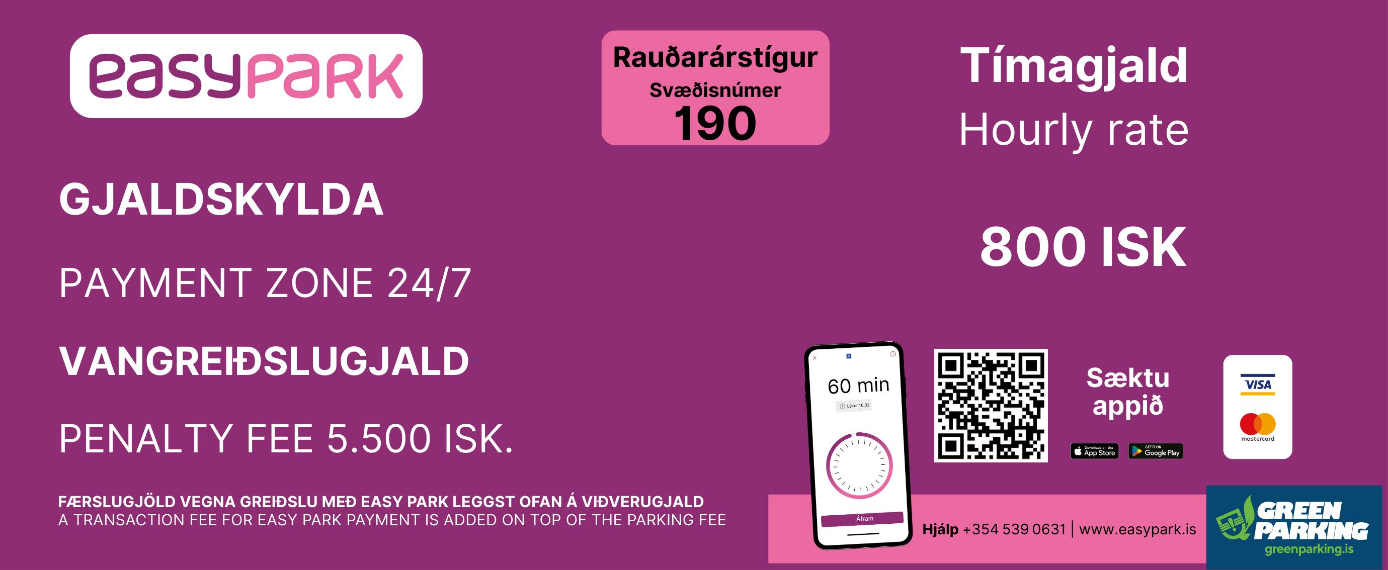 A parking supervisor is on site and monitors number plate registration for users who have not checked in via the Easy Park app, and therefore will have a service fee sent to their online bank. Registered owners or keepers of vehicles (if listed in the vehicle register) will be sent a claim via their online bank for the amount of ISK 4,500, in addition to a notification fee.
