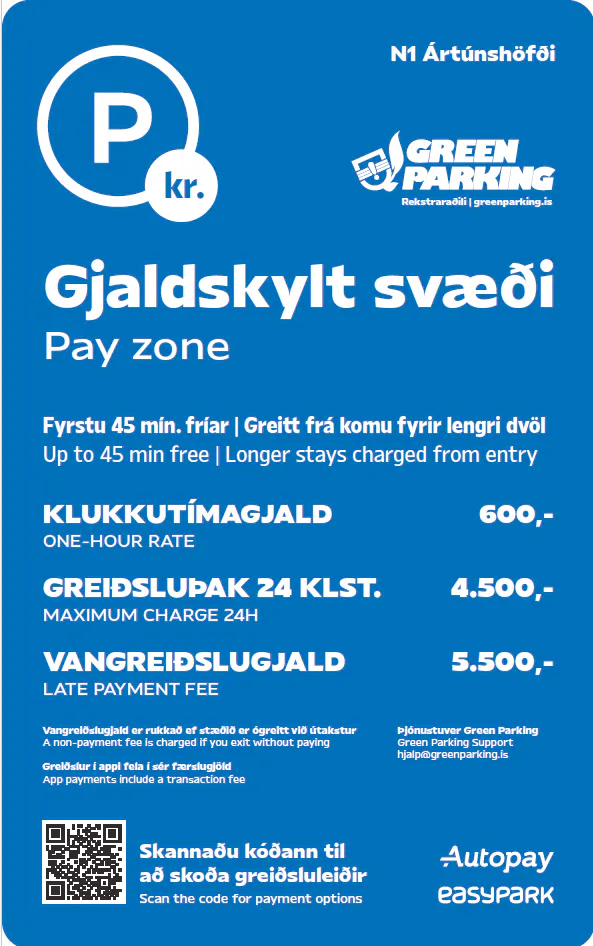 - Greiða má með EasyPark appinu eða með því að skanna QR-kóða sem er á upplýsingaskiltum á svæðinu.