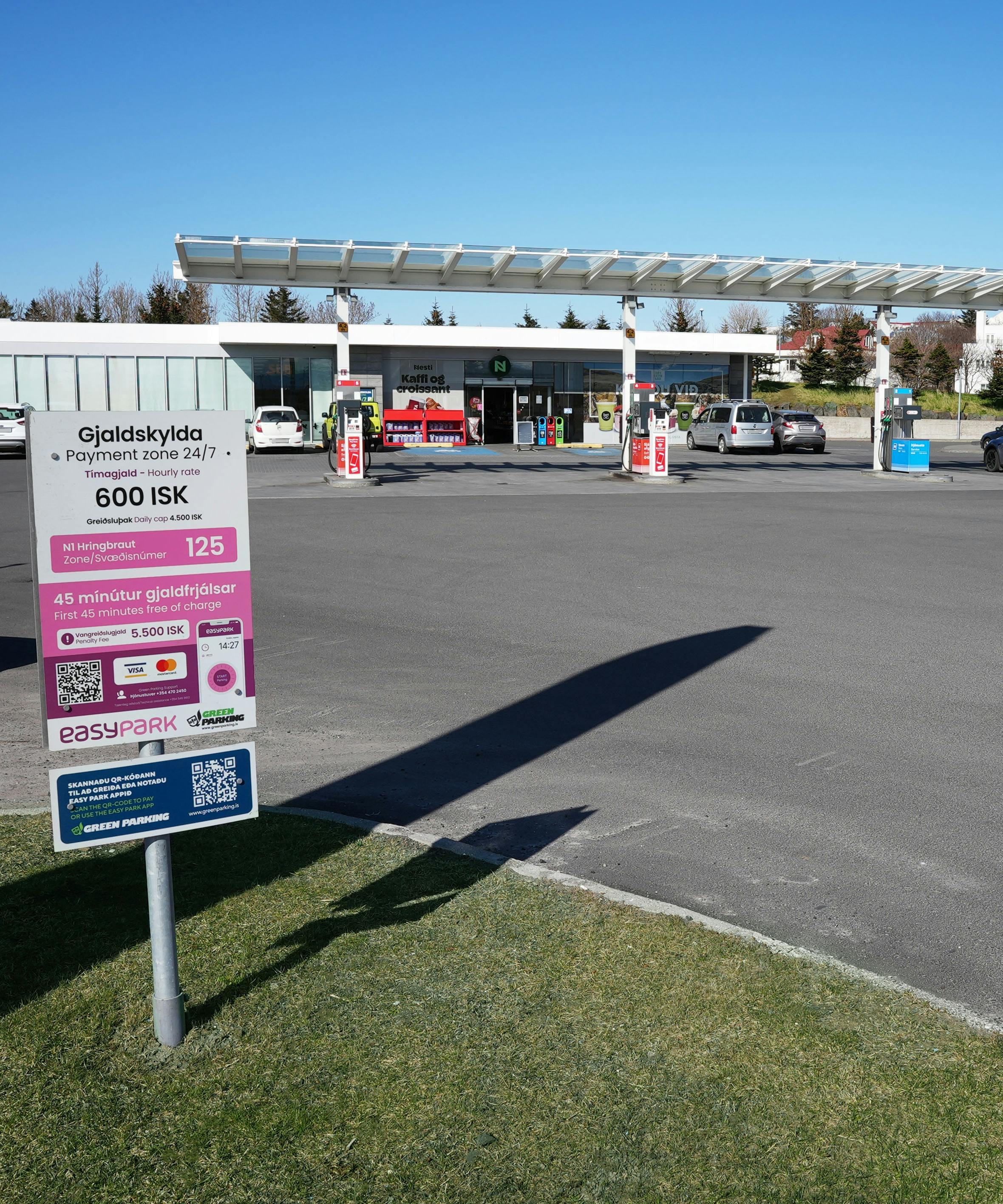 Greitt er fyrir bílastæði með greiðsluvél og eða sjálfvirkri greiðsluvél gegnum QR kóða sem er á bláu skiltunum.